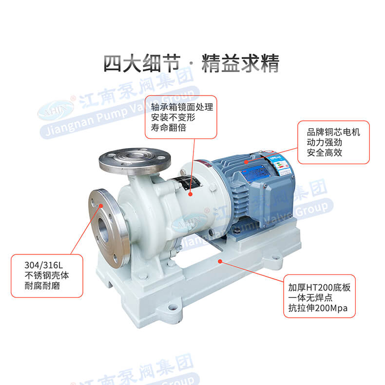 - JMC不銹鋼磁力泵全密封、無泄漏、清潔環保、運行靜音低振,是輸送易燃、易爆、腐蝕、貴重液體的優選用泵。因節能環保、可靠安全,并替代進口為用戶節約大量成本。廣泛應用于化工、制堿、石油、醫藥、衛生、農藥、造紙、染料、污水處理等領域。
