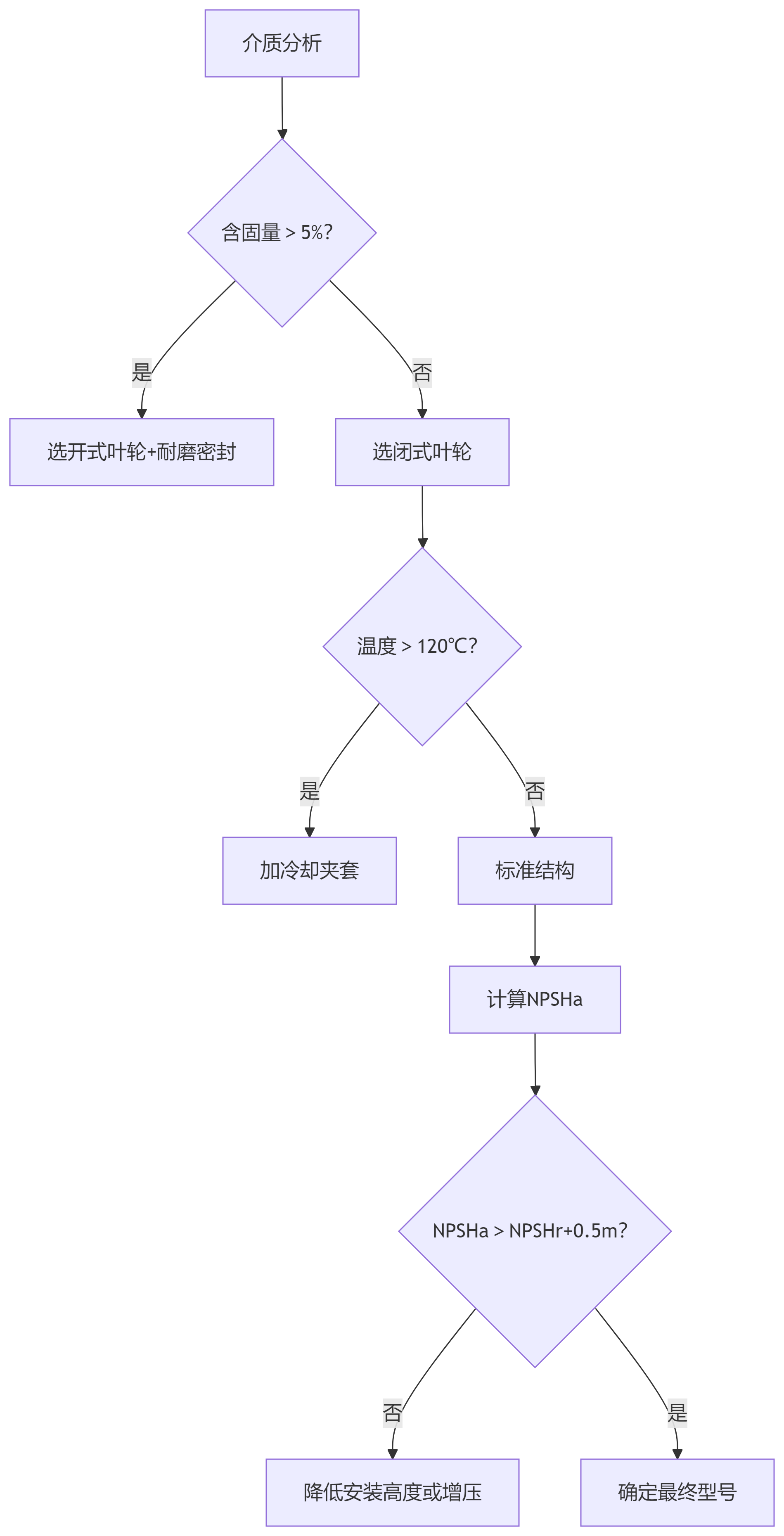 • 含固體顆粒:粘度>800cP或含固量≥10%時,選擇開式寬流道葉輪