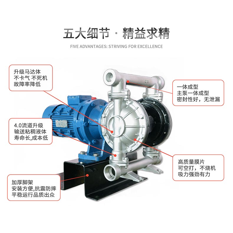 • 8、由于隔膜將被輸送介質和傳動機械件分開,所以介質非常不會向外泄漏;且電動隔膜泵本身無軸封,使用壽命大大延長;根據不同介質,隔膜可分為氯丁橡膠、氟橡膠、丁晴橡膠、聚四氟乙烯、聚氨酯等,可以滿足不同客戶的要求。